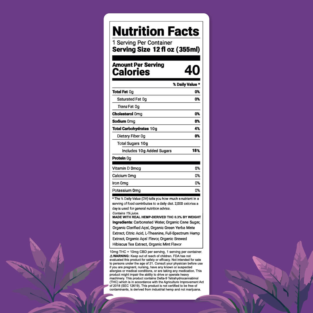 An invigorating fusion of antioxidant-rich açaí with refreshing mint for energized perception. All accompanied with hemp broad spectrum extract (THC + CBD)